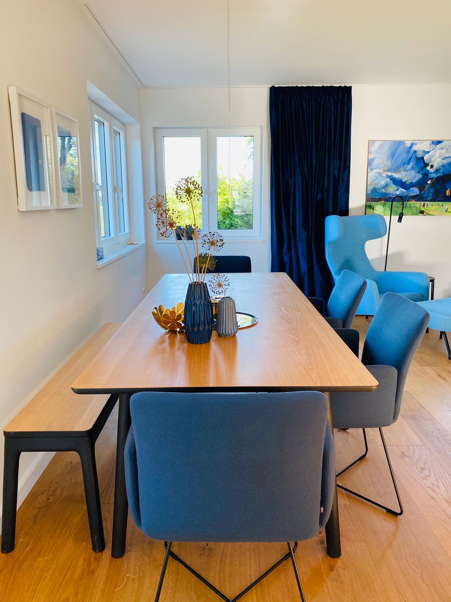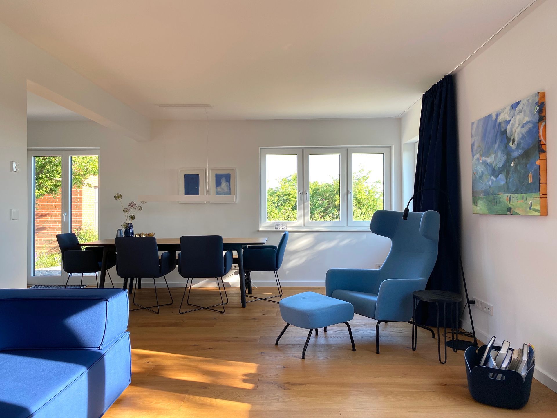 Sie betreten das Haus durch den Flur, der sich zum großzügigen Wohn-/Esszimmer mit angrenzender Küche öffnet. Das moderne und hochwertige Design der Einrichtung mit Sofa, Lesesessel und großem Esstisch lädt ein zu entspannten Stunden allein oder in Gesellschaft, der Kamin tut sein Übriges dazu.