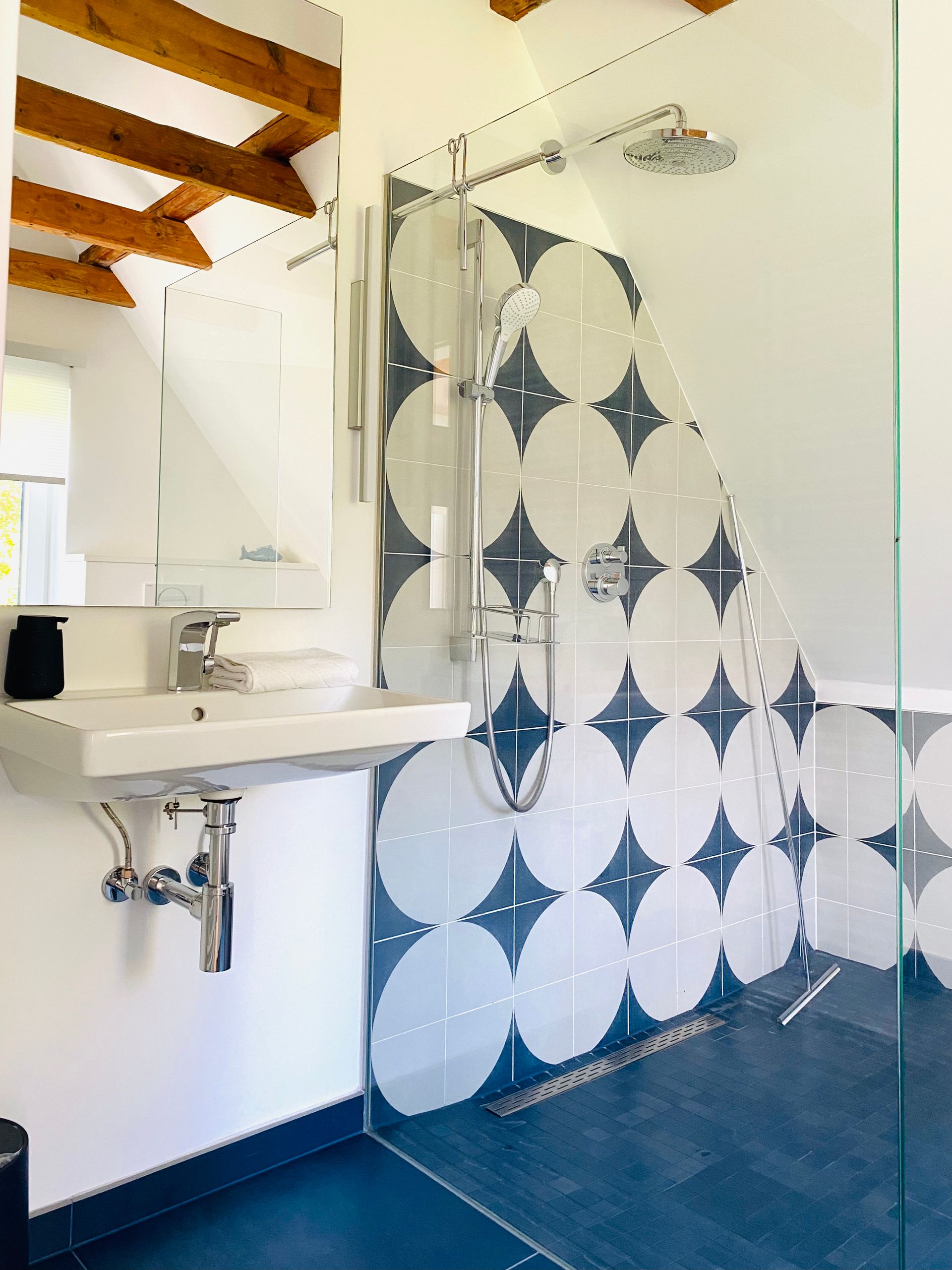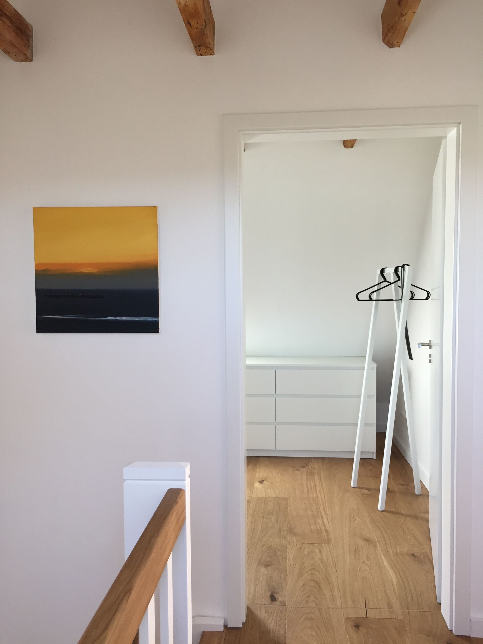 Die großzügigen Räume im Obergeschoss mit dem geöffneten Dachstuhl beherbergen zwei Schlafzimmer mit je einem Doppelbett (180/160 cm). Von beiden Zimmern können Sie das Meer sehen - die Husumer Bucht. Das zweite Badezimmer betreten Sie von dem kleineren Schlafzimmer.