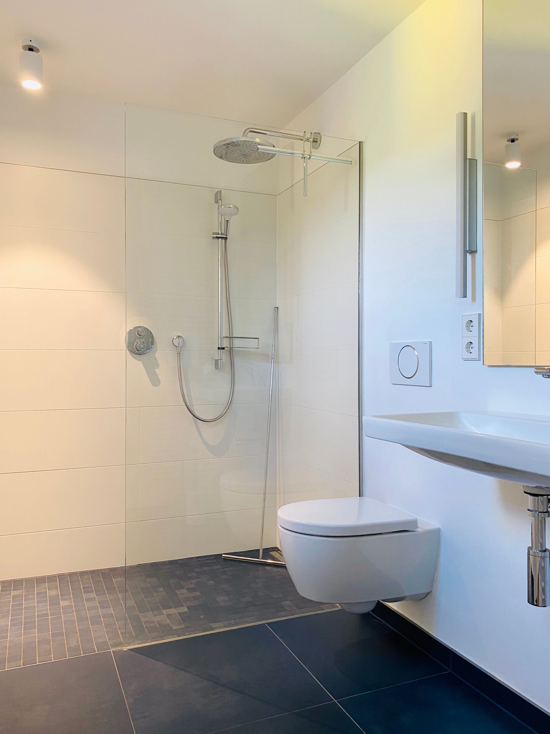 Im Erdgeschoss findet sich zudem das erste von zwei Bädern. Beide Badezimmer bieten Fußbodenheizung, Regendusche, Handtuchheizkörper, Spiegelheizung und Fön.